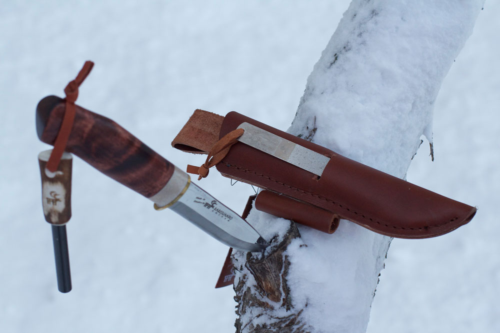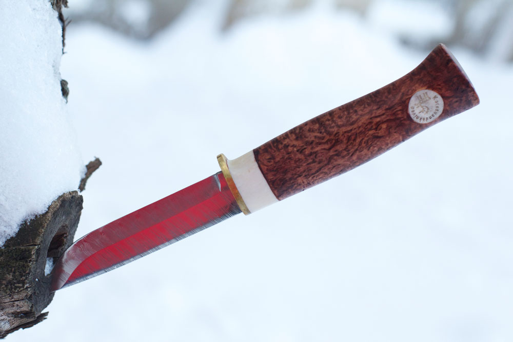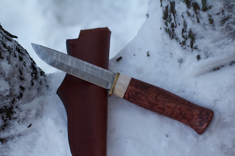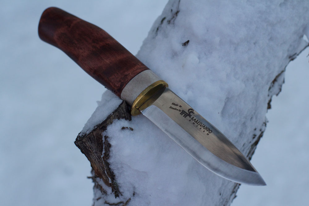 Что нужно настоящему охотнику?Выбирая новый нож, мы в первую очередь задумываемся на тему его применения – будь то охота, повседневное ношение или же просто полочный экспонат для коллекции. Для каждой упомянутой категории всегда есть свои негласные определенные критерии, которые очень важны при выборе ножа. Мы хотим, чтобы вещь обладала: → высоким функционалом → низкой ценой → привлекательным обликом, который бы всегда радовал нас во время использования и не вызывал ни малейшего сомнения в правильности сделанного выбора ![]() Говоря об охотничьем ноже как о рабочем инструменте, а не об обязательном стереотипном атрибуте охотника, мало кто ставит внешний вид изделия в первую тройку требований, выдвигаемых по отношению к нему. Первая тройка всегда подразумевает под собой функционал, который бы удовлетворил все потребности охотника при целевом использовании ножа. Но как должен выглядеть настоящий охотничий нож? С течением времени сформировалось ясное понимание того, что нужно настоящему охотнику.![]() Это обязательно должен быть нож: → размером чуть больше среднего → с клинком из качественной нержавеющей стали → с прочной ухватистой рукоятью → с подходящей геометрией клинка Ножевая классика: финки и саамские ножиСовременные веяния заставляют производителей внедрять все больше и больше нововведений, разрабатывать современный и далекий от классики дизайн, изменять технологии производства. Хорошо это или нет – судить потребителю, но, прошедшая огонь и воду классика, порой не заменима даже самыми современными и высокотехнологичными аналогами. ![]() Говоря о классике, мы подразумеваем традиционные и любимые большинством «финки» (пуукко) и «лапландцев» (саамские ножи). Внешний вид этих ножей практически не менялся с момента их появления на свет, а геометрия клинка считалась идеальной как для освежевания туши, так и для выполнения любых других бытовых задач. Шведские ножи из лучшей дамасской сталиКомпания Karesuando была основана в 1975 году в одноименной лапландской деревушке на севере Швеции и уже почти 40 лет производит свои ножи по неизменным технологиям. За всю историю было внедрено лишь три весомые инновации в производстве: → выпуск нескольких самых популярных моделей с рукоятью из пластика → нанесение покрытия на клинок по технологии DLC ![]() Основной упор в своем производстве компания делает на охотничьи ножи с фиксированным клинком из стали Sandvik 12C27 и на бланки клинков для самостоятельного изготовления ножа. Толщина клинка на разных моделях варьируется от 2.2 мм до 3.2 мм.