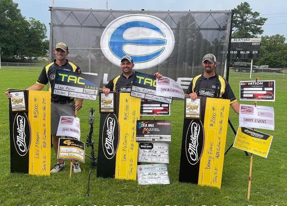 На недавнем мероприятии ASA в Каллмане, штат Алабама, команда Мэтьюз победила в мужском открытом дивизионе Pro. Дэн Маккарти (в центре) занял первое место, Леви Морган (слева) — второе, а Дэнни Эванс (справа) — третье.