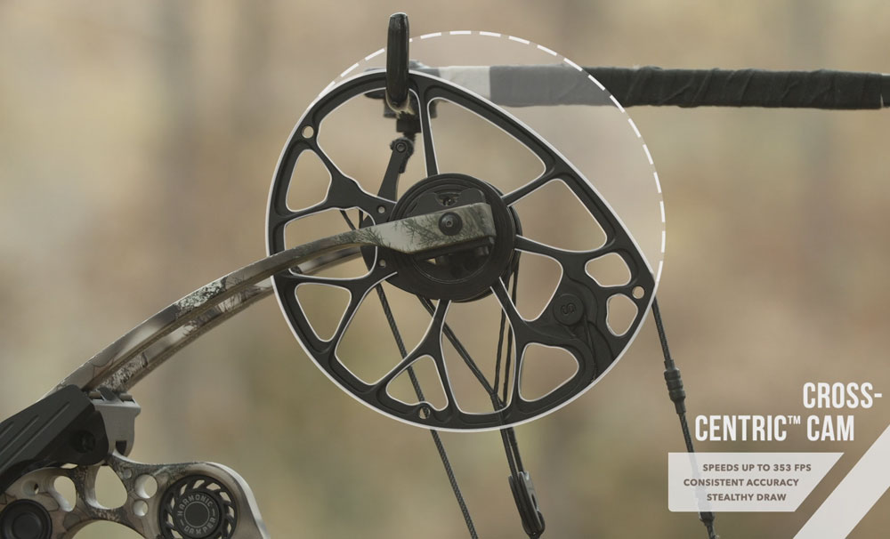 Вдохновленная технологией No Cam™, компания разработала совершенно новую систему блоков CrossCentric™, в которой тетива проходит часть пути, заложенного концентрической конструкцией NO CAM для обеспечения бесшумного натяжения и скорости до 353 фут/сек.