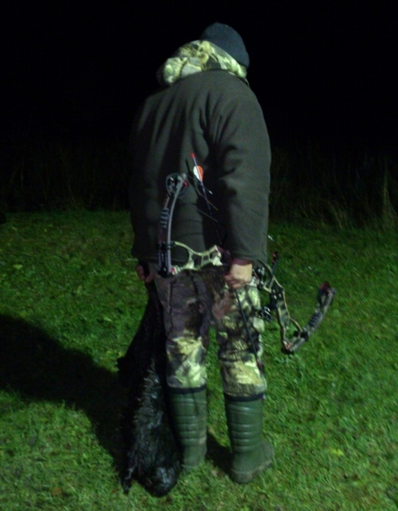 Яркий свет фонаря выхватил тушку бобра. Он поднял ко мне голову в тот момент, когда я спустил релиз, и стрела с громким стуком ударила в дерево, пригвоздив его голову. Бобёр откинулся сразу.