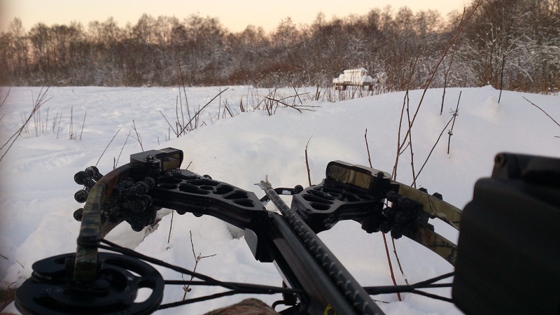 Мы выдвинулись на кромку поля, где уже неделю для нас велась прикормка оленей. Примерно в тридцати метрах от места прикормки мы расположились в яме, скрывшись за снежным бугром и порослью. ![]() Нам надо было отстрелить шильника - оленя этого года с рогами прямыми, как шило. Мы уже имели неудачный опыт общения с этими рогатыми, поэтому взяли одни из самых скоростных арбалетов - Один из арбалетов был заряжен лёгкой стрелой EASTON Flatline, что позволило развить довольно высокую скорость и надеяться, что реакции оленя на выстрел не хватит, чтобы уйти от надёжного попадания в убойную зону. Из-за того что был риск выхода кабанов на кормушку, второй арбалет был заряжен тяжёлой стрелой EASTON FMJ, чтобы обеспечить надёжное пробитие любой «бронированной пятаковидной» цели. Погода отличная! Сначала было солнышко, минус 7 градусов и слабый ветер в лицо - мы сели с подветренной стороны. ![]() Прошёл час. Смеркалось… Температура пошла вниз. Уже через пару часов засидки на стрелах и стволах арбалетов появился иней, ещё через некоторое время инеем покрылись и прицелы. Далее начали замерзать и мы, - не рассчитывая на такой мороз, оделись довольно легко. Через три часа, решив, что животные, несмотря на два ведра морковки, так и не выйдут из леса, мы прекратили охоту.