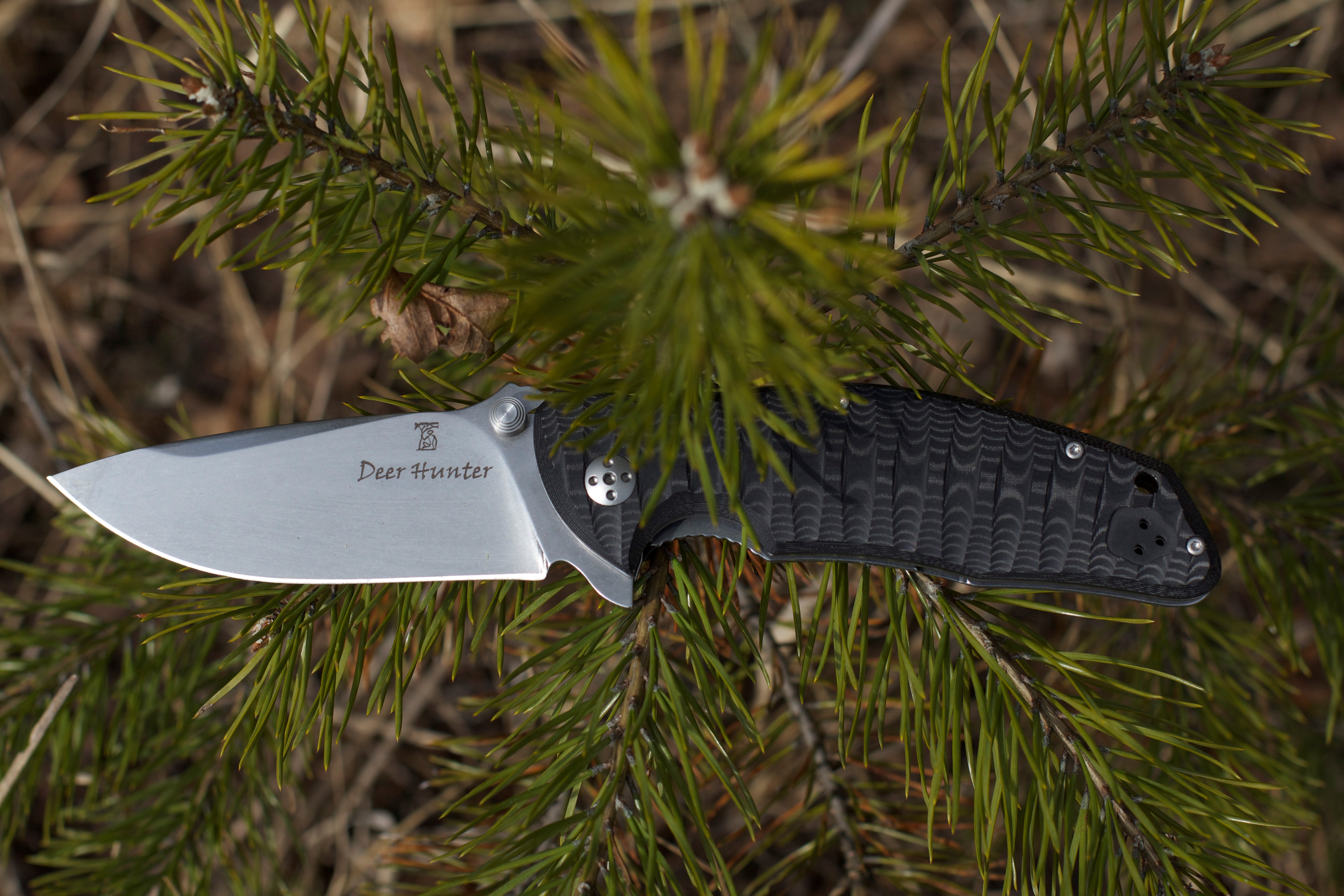 Нож открывается двумя способами: большим пальцем за шпенёк или указательным за флиппер. При использовании второго способа Deer Hunter открывается молниеносно. Звук при этом низкий, не слышно звона стали – сказывается великолепная подгонка деталей.