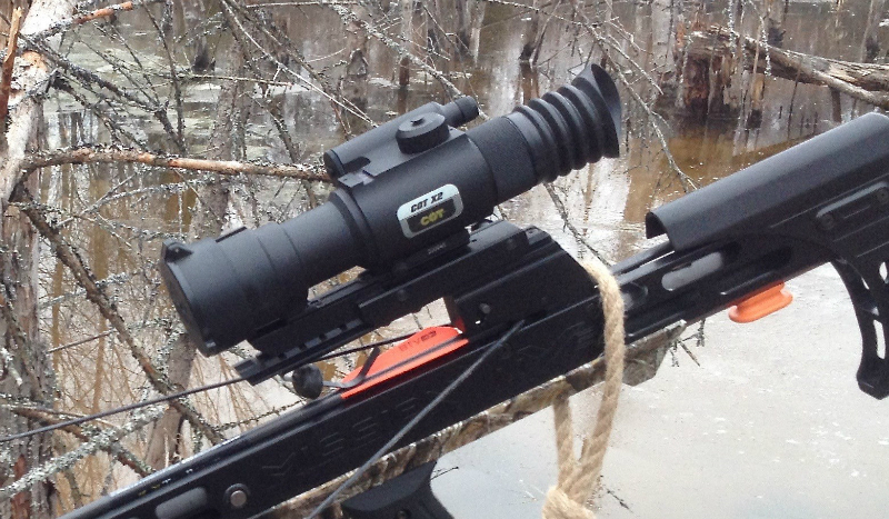 А тепловизор всё фиксировал движение двух ярких пятен на чёрном фоне… Ночной прицел СОТ-Х2 с кратностью всего 2х обладает впечатляющим углом обзора в 18 градусов, захватывает сразу большое поле зрения и способен вдвое сократить расстояние наблюдения за целью. Именно в него, основываясь на показания тепловизора, нам и удалось идентифициоровать цель не как две утки на 100 метрах, а как два глаза бобра, сидящего в 20 метрах от нас. Оказывается, у бобра тёплым горят только глаза!