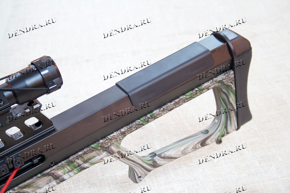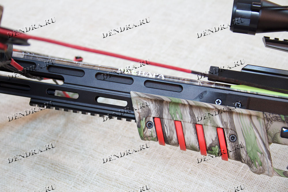 Цвет зеленого камуфляжа удобен в условиях маскировки на охоте. Красные вставки на съемном цевье придают привлекательности дизайну и делают арбалет узнаваемым с первого взгляда.