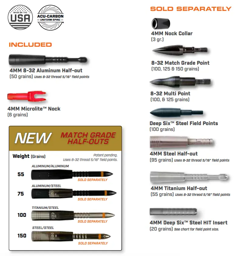 • Поставляется в дюжине голых древков и в полутора дюжинах оперенных конфигураций (совместимых со стандартной резьбой 8-32 брод-наконечников и полевыми наконечниками)