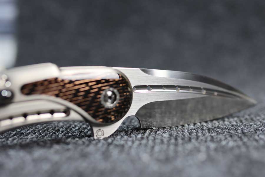 Клинок с флиппером изготовлен из порошковой стали Carpenter CTS — 204P, имеет особую форму — своего рода уорнклифф, перетекающий в дроп-пойнт. Финиш клинка — ручное сатинирование, дол полирован в зеркало. В титановом фрейме — декоративные вставки из карбона Star Strike (англ. – «звёздный удар»). Как Вы могли заметить, в структуре углепластика присутствуют волокна меди. Дело в том, что Star Strike является стилистической интерпретацией карбона Lightning Strike (англ. – «удар молнии»).