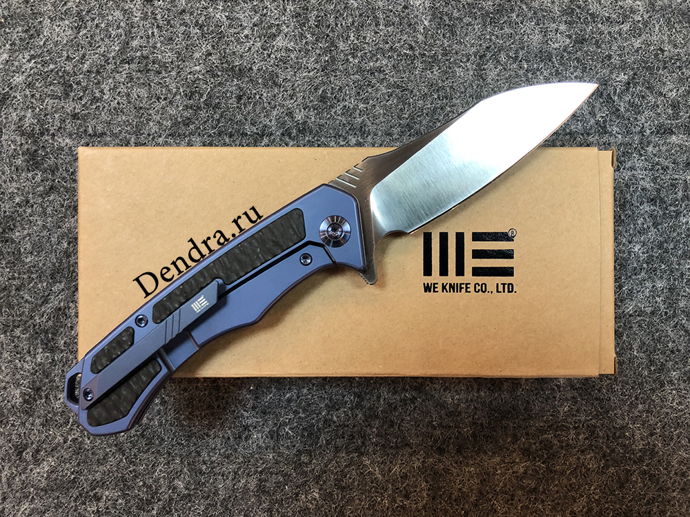 Нож складной, сталь M390, длина клинка 87,2 мм, рукоять титан/карбон файбер, цвет синий с серым, кли