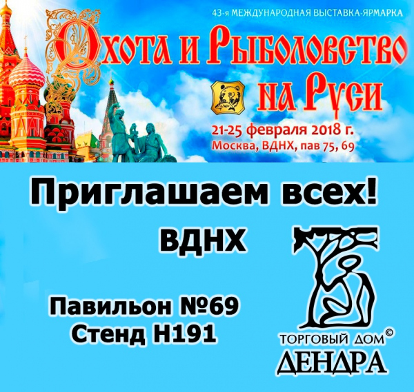 Мы приглашаем Вас посетить стенд «Торгового Дома «ДЕНДРА» на предстоящей Выставке “Охота и Рыболовство на Руси” с 21 по 25 февраля на ВДНХ в павильоне №75.